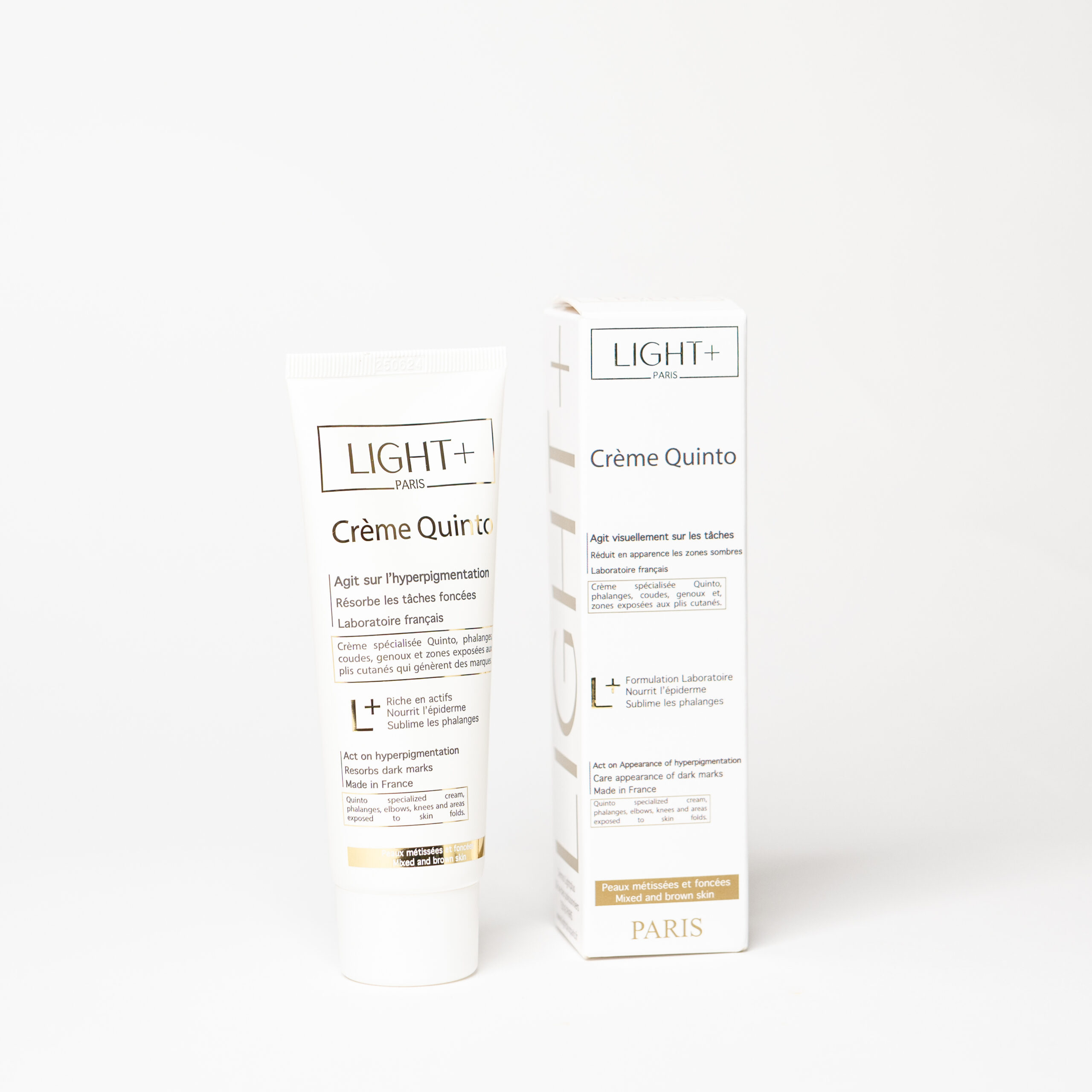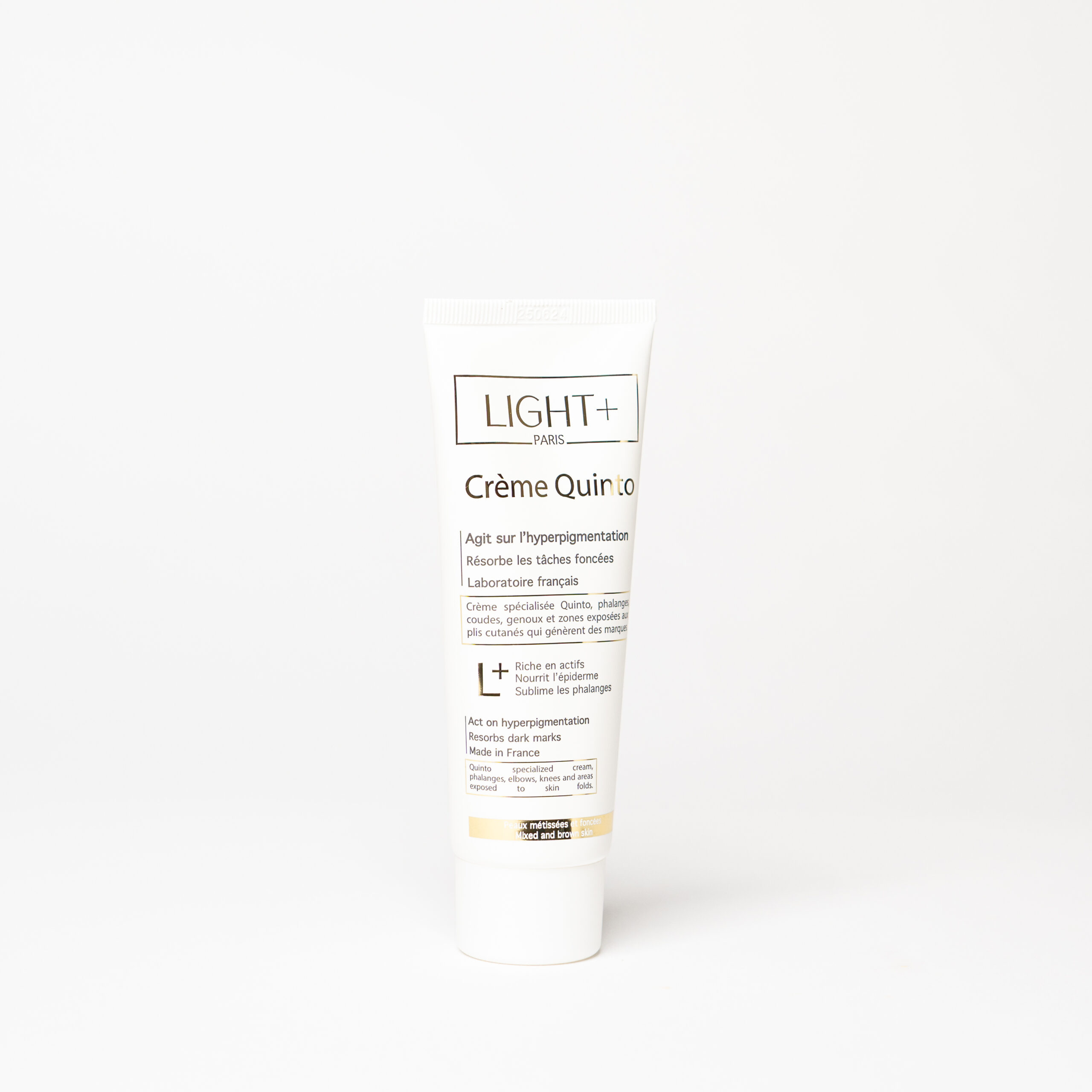 La Crème Quinto Light+ Paris est spécialement conçue pour agir sur l’hyperpigmentation et réduire l’apparence des taches foncées sur les zones les plus exposées et sensibles (coudes, genoux, phalanges). Sa formule enrichie en actifs ciblés nourrit l’épiderme et sublime les phalanges tout en redonnant à la peau un aspect uniforme et lumineux.